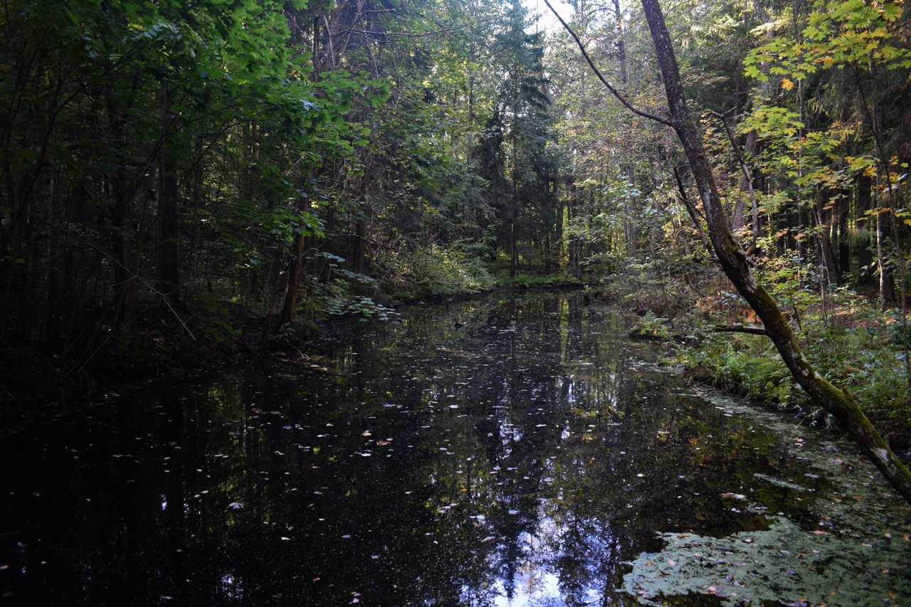 Мост устроен над запрудой, и вверх по течению мы видим небольшой пруд. А дальше, на заднем плане видна еще одна запруда поменьше. Потом мы ее увидим вблизи.