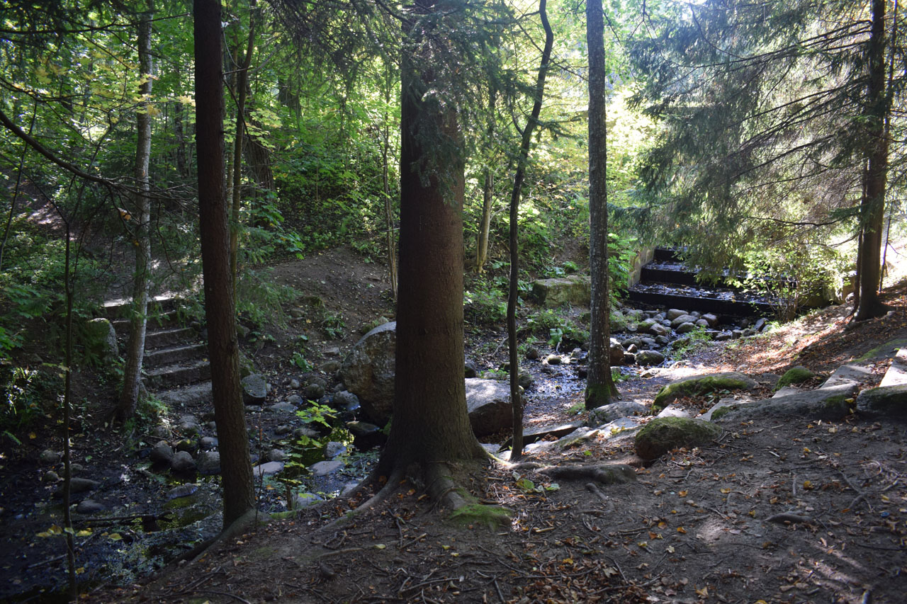 Ближе - лестница, спускающаяся к речке (на другом берегу такая же лестница, отсюда она не видна) и камни на дне. Лестницы и камни крупным планом: